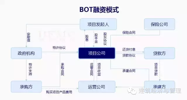 参与主体一个典型的BOT项目的参与人有ZF、BOT项目公司、投资人、银行或财团以及承担设计、建设和经营的有关公司。
