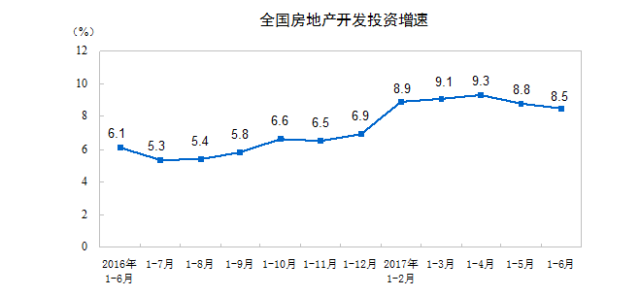 2017年1-6月份,全国房地产开发投资50610亿元,同比名义增长8.5%,增速比1-5月份回落0.3个百分点。