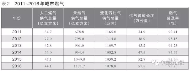2016年,人工煤气供气总量44.1亿立方米,天然气供气总量1171.7亿立方米,液化石油气供气总量1078.8万吨,分别比上年减少6.5%、增长12.6%、增长3.8%。人工煤气供气管道长度1.9万公里,天然气供气管道长度55.1万公里,液化石油气供气管道长度0.9万公里,分别比上年减少13.0%、增长10.6%、减少3.3%。用气人口4.57亿人,燃气普及率95.75%,比上年增加0.45个百分点。(表2)
