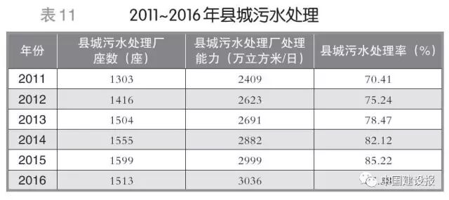 2016年年末,全国县城共有污水处理厂1513座,比上年减少86座,污水厂日处理能力3036万立方米,比上年增长1.2%,排水管道长度17.2万公里,比上年增长2.4%。县城全年污水处理总量81亿立方米,污水处理率87.38%,比上年增加2.16个百分点,其中污水处理厂集中处理率85.8%,比上年增加2.34个百分点。(表11)