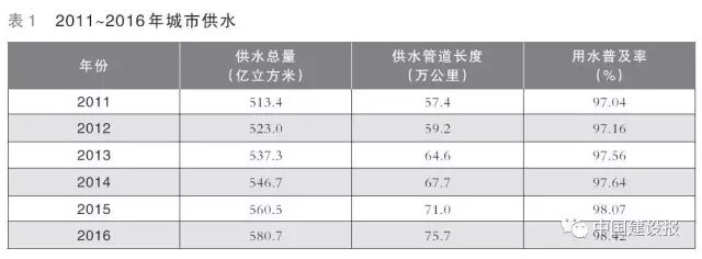 2016年年末,城市供水综合生产能力达到3.03亿立方米/日,比上年增长2.2%,其中,公共供水能力2.39亿立方米/日,比上年增长3.4%。供水管道长度75.7万公里,比上年增长6.5%。2016年,年供水总量580.7亿立方米,其中,生产运营用水160.7亿立方米,公共服务用水81.6亿立方米,居民家庭用水220.5亿立方米。用水人口4.70亿人,人均日生活用水量176.9升,用水普及率98.42%[6],比上年增加0.35个百分点。2016年,城市节约用水57.6亿立方米,节水措施总投资29.5亿元。(表1)