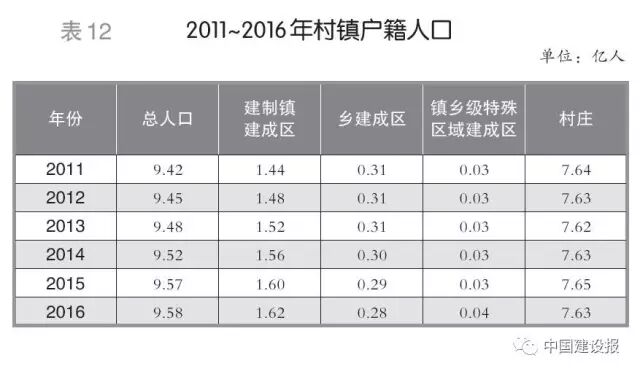 2016年年末,全国共有建制镇20883个,乡(苏木、民族乡、民族苏木)10872个。据对18099个建制镇、10883个乡(苏木、民族乡、民族苏木)、775个镇乡级特殊区域和261.7万个自然村(其中村民委员会所在地52.6万个)统计汇总[9],村镇户籍总人口9.58亿。其中,建制镇建成区1.62亿,占村镇总人口的16.96%;乡建成区0.28亿,占村镇总人口的2.92%;镇乡级特殊区域建成区0.04亿,占村镇总人口的0.45%;村庄7.63亿,占村镇总人口的79.67%。(表12)