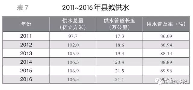 2016年年末,县城供水综合生产能力达到0.54亿立方米/日,比上年减少6.0%,其中,公共供水能力0.46亿立方米/日,比上年减少3.3%。供水管道长度21.1万公里,比上年减少1.6%。2016年,全年供水总量106.5亿立方米,其中生产运营用水27.0亿立方米,公共服务用水11.6亿立方米,居民家庭用水48.9亿立方米。用水人口1.40亿人,用水普及率90.5%,比上年增加0.54个百分点,人均日生活用水量119.43升。2016年,县城节约用水2.3亿立方米,节水措施总投资2.98亿元。(表7)