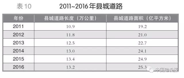 2016年年末,县城道路长度13.2万公里,比上年减少1.4%,道路面积25.3亿平方米,比上年增长1.6%,其中人行道面积6.3亿平方米,人均城市道路面积16.41平方米,比上年增加0.43平方米。2016年,全国县城新建地下综合管廊214公里,形成廊体59公里。(表10)