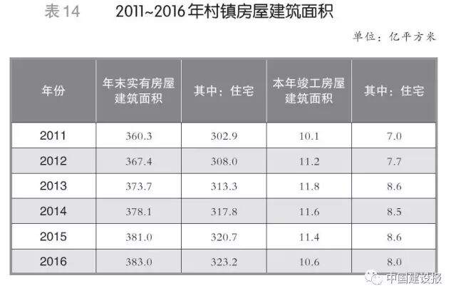 2016年,全国村镇房屋竣工建筑面积10.6亿平方米,其中住宅8.0亿平方米,公共建筑1.1亿平方米,生产性建筑1.5亿平方米。2016年年末,全国村镇实有房屋建筑面积383.0亿平方米,其中住宅323.2亿平方米,公共建筑24.0亿平方米,生产性建筑35.8亿平方米,分别占84.4%、6.3%、9.3%。