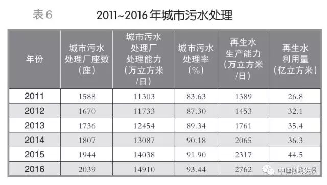 2016年年末,全国城市共有污水处理厂2039座,比上年增加95座,污水处理厂日处理能力14910万立方米,比上年增长6.2%,排水管道长度57.7万公里,比上年增长6.9%。城市年污水处理总量448.8亿立方米,城市污水处理率93.44%,比上年增加1.54个百分点,其中污水处理厂集中处理率89.80%,比上年增加1.83个百分点。城市再生水日生产能力2762万立方米,再生水利用量45.3亿立方米。(表6)