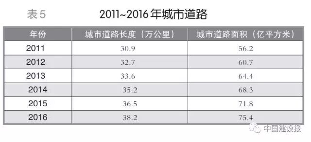 2016年年末,城市道路长度38.2万公里,比上年增长4.8%,道路面积75.4亿平方米,比上年增长5.0%,其中人行道面积16.9亿平方米。人均城市道路面积15.8平方米,比上年增加0.2平方米。2016年,全国城市新建地下综合管廊1791公里,形成廊体479公里。(表5)