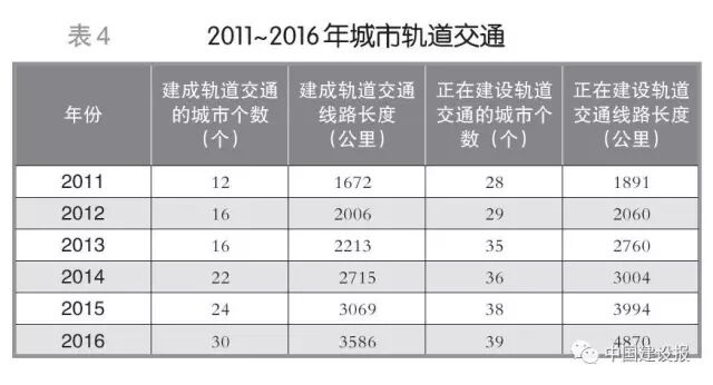 2016年年末,全国有30个[7]城市建成轨道交通,线路长度3586公里,分别比上年增加6个城市,增长16.8%,车站数2383个,其中换乘站541个,配置车辆数19284辆。全国39个[7]城市在建轨道交通,线路长度4870公里,分别比上年增加1个城市,增长21.9%,车站数3080个,其中换乘站827个。(表4)