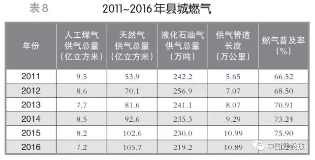 2016年,人工煤气供应总量7.2亿立方米,天然气供气总量105.7亿立方米,液化石油气供气总量219.2万吨,分别比上年减少12.5%、增长3.0%、减少4.7%。人工煤气供气管道长度0.14万公里,天然气供气管道长度10.60万公里,液化石油气供气管道长度0.16万公里,分别比上年减少0.7%、减少0.5%、减少23.6%。用气人口1.21亿人,燃气普及率78.19%,比上年增加2.29个百分点。(表8)