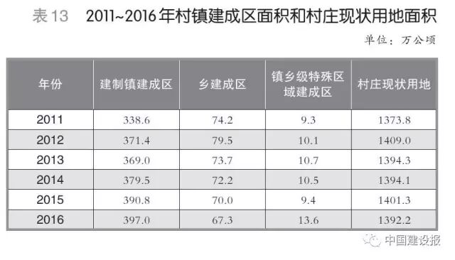 2016年年末,全国建制镇建成区面积397.0万公顷,平均每个建制镇建成区占地219公顷,人口密度4902人/平方公里(含暂住人口);乡建成区67.3万公顷,平均每个乡建成区占地62公顷,人口密度4450人/平方公里(含暂住人口);镇乡级特殊区域建成区13.6万公顷,平均每个镇乡级特殊区域建成区占地176公顷,人口密度3665人/平方公里(含暂住人口)。(表13)