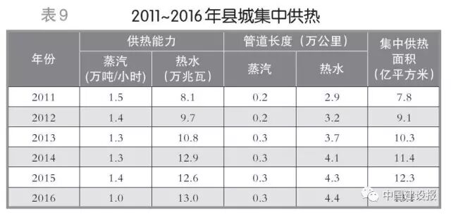 2016年年末,供热能力(蒸汽)1.0万吨/小时,比上年减少25.4%,供热能力(热水)13.0万兆瓦,比上年增长3.7%,供热管道4.7万公里,比上年增长1.4%,集中供热面积13.1亿平方米,比上年增长6.5%。(表9)
