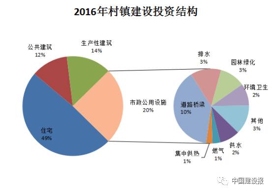 2016年,全国村镇建设总投资15908亿元。按地域分,建制镇建成区6825亿元,乡建成区524亿元,镇乡级特殊区域建成区238亿元,村庄8321亿元,分别占总投资的42.9%、3.3%、1.5%、52.3%。按用途分,房屋建设投资11882亿元,市政公用设施建设投资4026亿元,分别占总投资的74.7%、25.3%。
