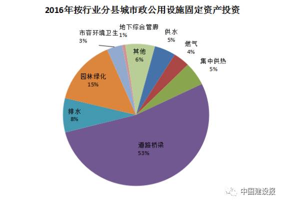 2016年,完成县城市政公用设施固定资产投资3394.5亿元,比上年增长9.5%。其中:道路桥梁、园林绿化、排水分别占县城市政公用设施固定资产投资的53.2%、14.8%和7.7%。