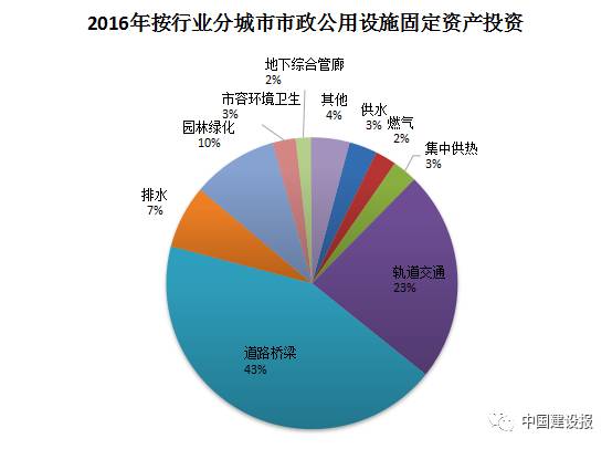 2016年完成城市市政公用设施固定资产投资17460亿元,比上年增长7.7%,占同期全社会固定资产投资总额的2.88%。其中,道路桥梁、轨道交通、园林绿化投资分别占城市市政公用设施固定资产投资的43.3%、23.4%和9.6%。