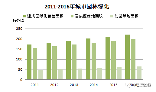 2016年年末,城市建成区绿化覆盖面积220.4万公顷,比上年增长4.7%,建成区绿化覆盖率40.30%,比上年增加0.18个百分点;建成区绿地面积199.3万公顷,比上年增长4.4%,建成区绿地率36.43%,比上年增加0.07个百分点;公园绿地面积65.4万公顷,比上年增长6.4%,人均公园绿地面积13.70平方米,比上年增加0.35平方米。