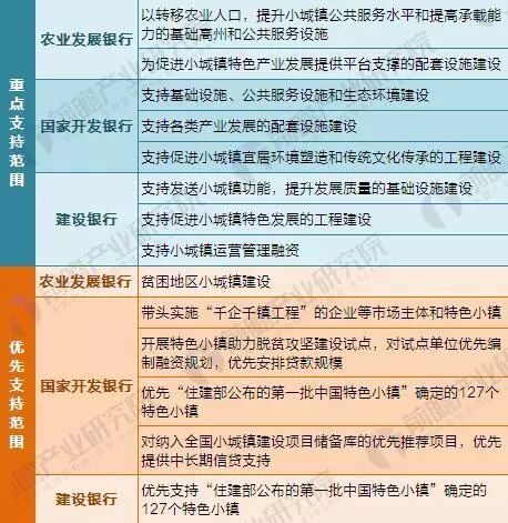 特色小镇的金融支持政策能够指导地方特色小镇的建设规划和项目投融资创新,确保项目资金落地,全面提升小城镇建设水平和发展质量。综合各大银行政策的支持范围包括重点支持项目和优先支持项目。