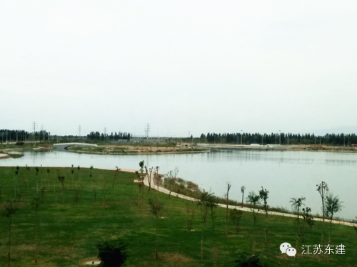 1:湖岸景观平台、景观拱桥、及步行道的木塑地板、栏杆已全部完成;